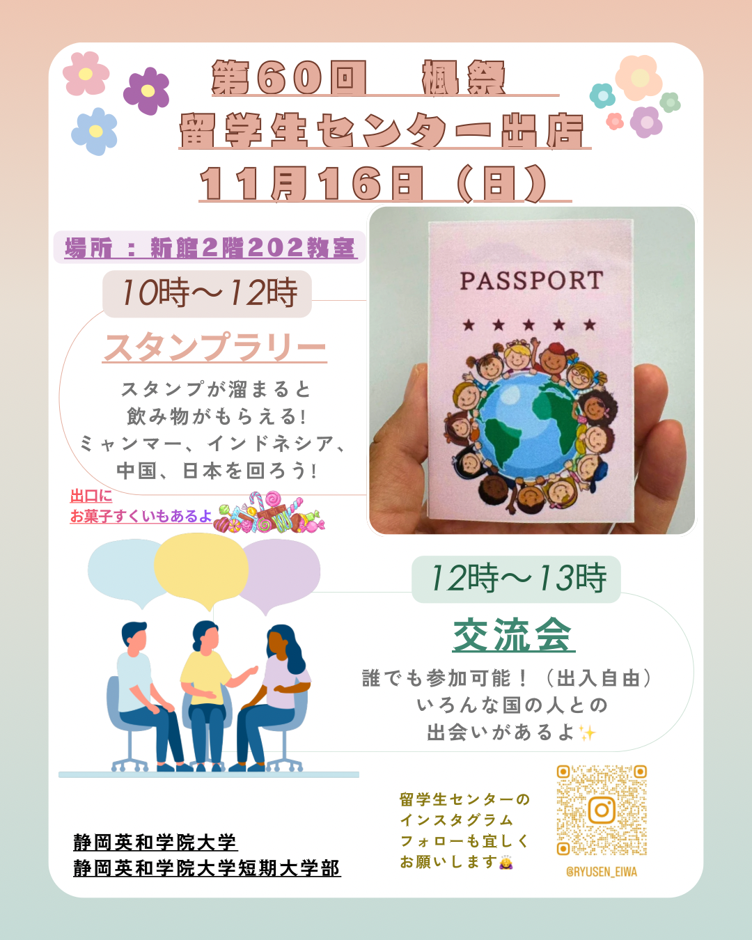 静岡英和学院大学第60回楓祭にて留学生センターが出店をします。 詳細につきましては添付のチラシをご確認ください。