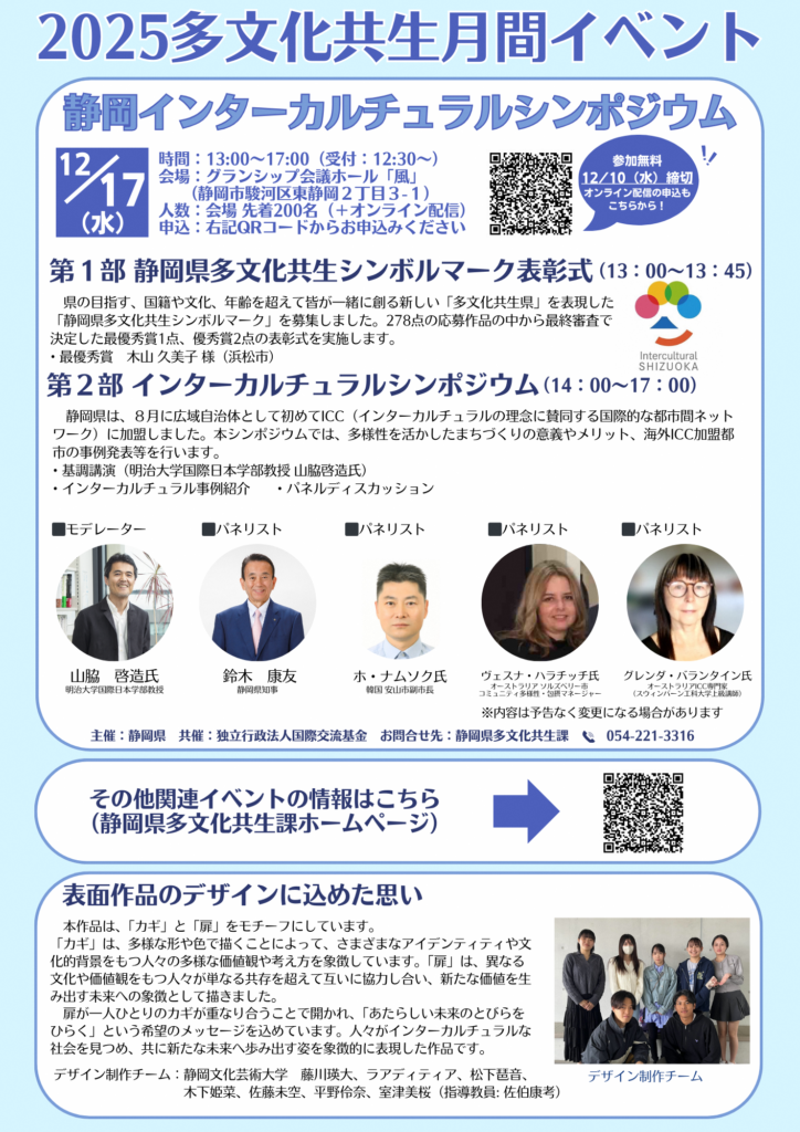 国籍や文化、年齢を超えて皆が一緒に創る新しい「多文化共生県」を目指して新設する「多文化共生月間」の基幹イベントとして、静岡県が8月に広域自治体として初めてICCに加盟したことを記念した県民向けシンポジウムを開催します。