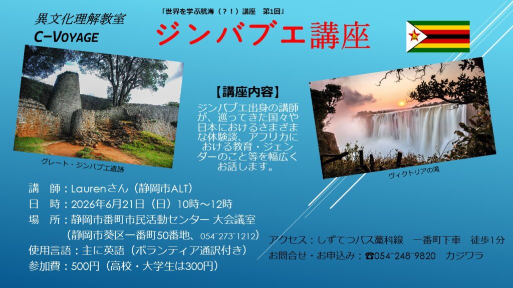 初講座は、アフリカ・ジンバブエ出身の静岡市ALT ローレン(Lauren)さんを講師にお招きして、さまざまな体験談をお話しいただきます。 皆様のご参加をお待ちしています。