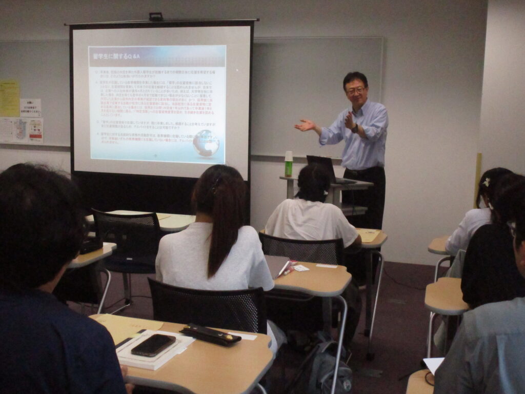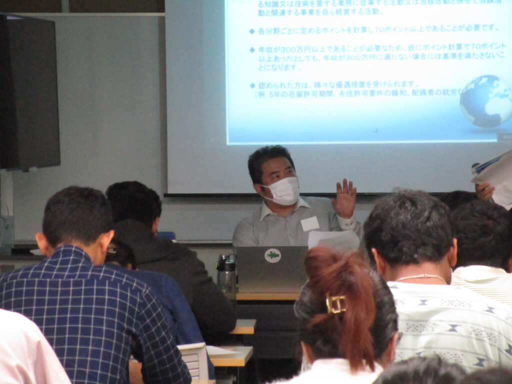 続いて、アルバイト先にそのまま就職できるか、9月卒業の場合はどうしたらよいか、卒業後にアルバイトはできるか等、留学生からよく聞かれる質問とそれに対する回答をご紹介いただきました。その他の注意点として、申請時には国民健康保険や年金保険、市県民税の滞納がないか厳しくチェックされること、年金の免除制度、アルバイト超過についてもお話がありました。終了後の質疑応答では卒業後の就労制限や家族滞在、永住権などに関する質問が寄せられ、学生たちの関心の高さがうかがえました。留学生の皆さんが本日学んだ就職活動や在留資格についての知識を活かして、日本での就職活動に臨んでくれることを願っています。