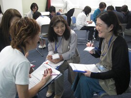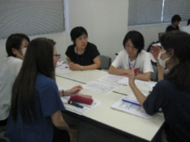 第4回目の講座では、日本語学習ポートフォリオと学習者オリエンテーションについて考えました。受講者の携わる教室で使用しているポートフォリオをみながら、その特徴やねらいなどを話し合ったほか、コース開始前にオリエンテーションを行う重要性や組み込む内容などを話し合いました。