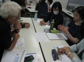 第2回目の講座では、対話交流型教室の意義について学んだ後、日本語が初期レベルの学習者とのコミュニケーションの取り方を体験するワークショップを行い、県の学習教材の使い方やワークシートの各ワークの目的等を日本語教育の参照枠と照らし合わせながら考えました。県が推進する対話交流型教室への理解を深め、言葉を使わない対話活動の楽しさを知り、教室活動の進め方について学びました。